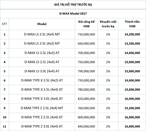 Đối với các dòng xe bán tải Isuzu D-MAX, khách hàng sẽ được hỗ trợ 100% lệ phí trước bạ khi mua xe trong thời gian khuyến mãi: