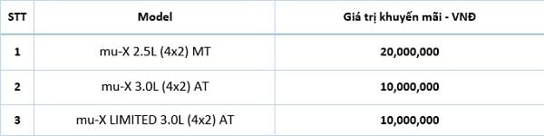 Đối với các dòng xe thể thao đa dụng Isuzu mu-X, khi mua xe trong tháng 4, khách hàng sẽ được tặng ngay tiền mặt có giá trị cụ thể như sau: