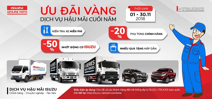 Nhằm tri ân khách hàng đã luôn tin tưởng và sử dụng sản phẩm cũng như dịch vụ của chúng tôi, Isuzu tung ra chương trình "Ưu đãi vàng cho dịch vụ hậu mãi cuối năm" từ ngày 01. 11 đến 30.11.2018. Theo đó, khách hàng sẽ được hưởng những ưu đãi sau: