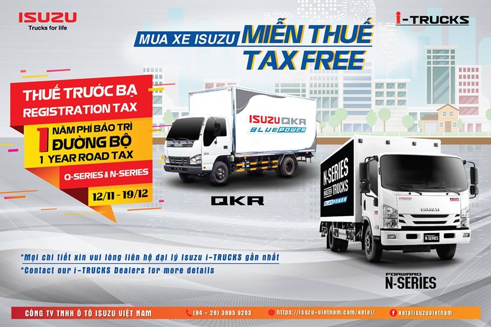 Nhằm hỗ trợ người tiêu dùng và các đơn vị vận tải có được chiếc xe phù hợp với hoạt động sản xuất kinh doanh thời điểm cuối năm, Isuzu thực hiện chương trình khuyến mại đặc biệt cho các khách hàng chọn mua sản phẩm xe tải nhẹ công nghệ Blue Power Euro 4 mới QKR và N-Series: